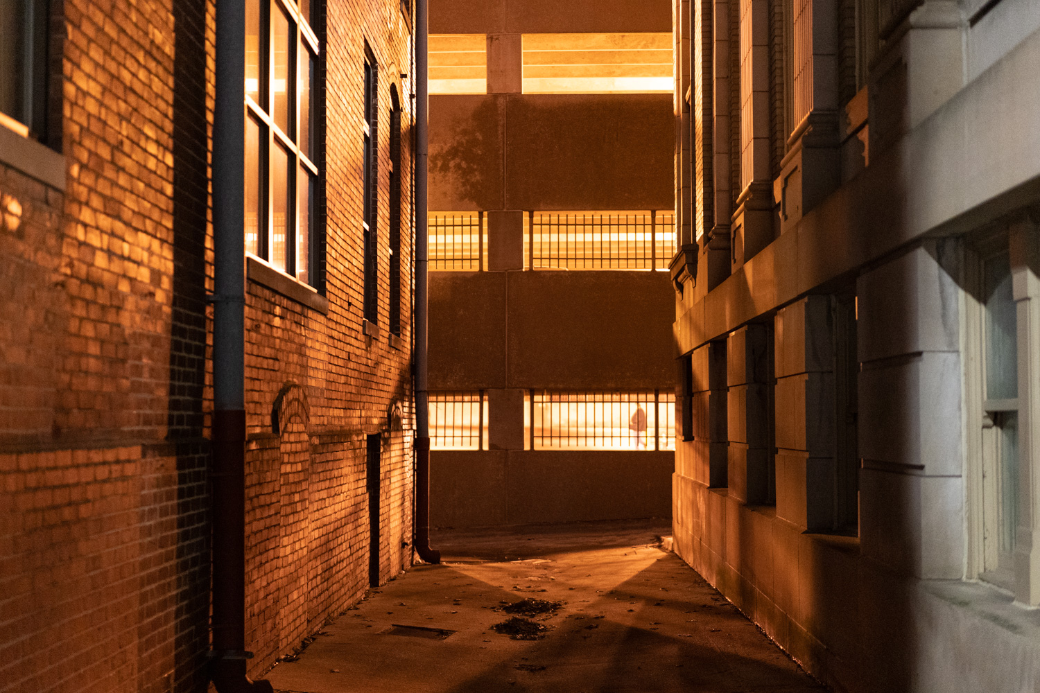 Alley lit by a parking garage at night, Topeka, Kansas 2019